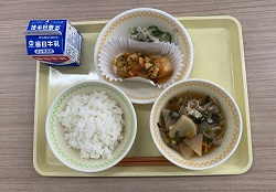20 | 白ごはん 牛乳 ひきわり大豆みそ 手巻きのり キャベツときゅうりの浅漬け 肉じゃがのうま煮(鶏肉) |